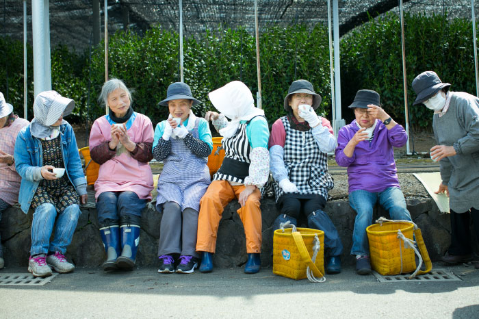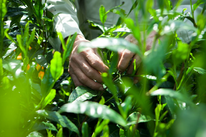 茶葉は摘むタイミングが重要となり、1日の遅れが命取りとなる。その為お茶摘みは近隣の方々の力を借り時には40名以上で素早く摘み取りを行う。